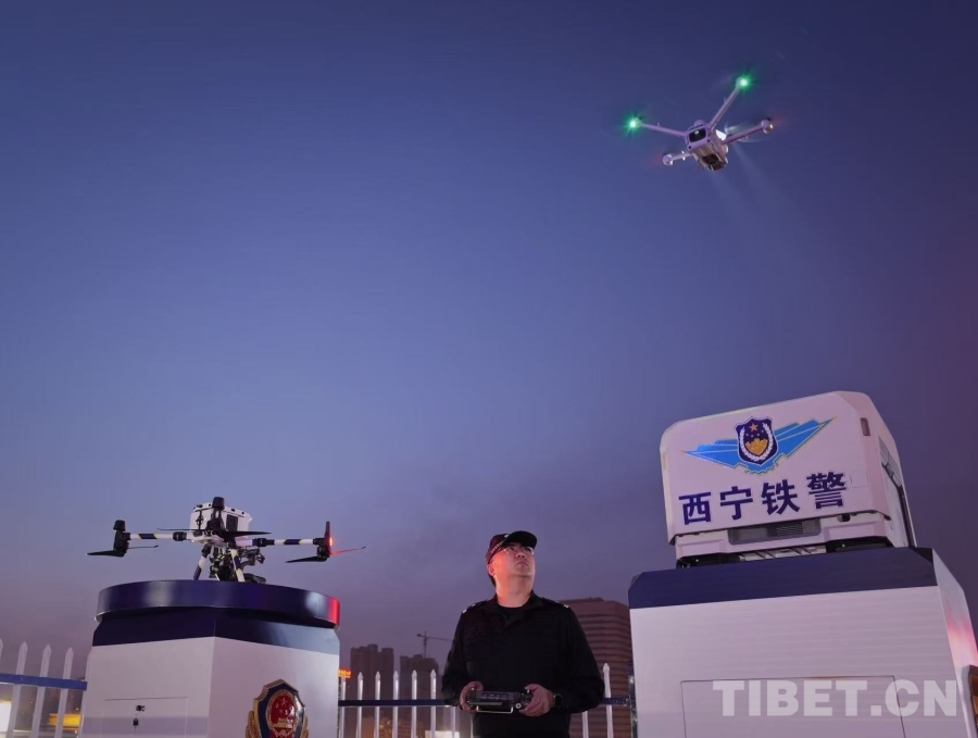 图为西宁铁警操作无人机开展空中巡防,用科技手段守护铁路线路的安全稳定