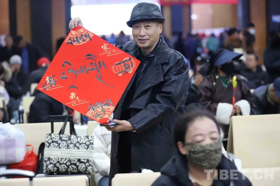 图为春运首日拉萨站为旅客送上祝福