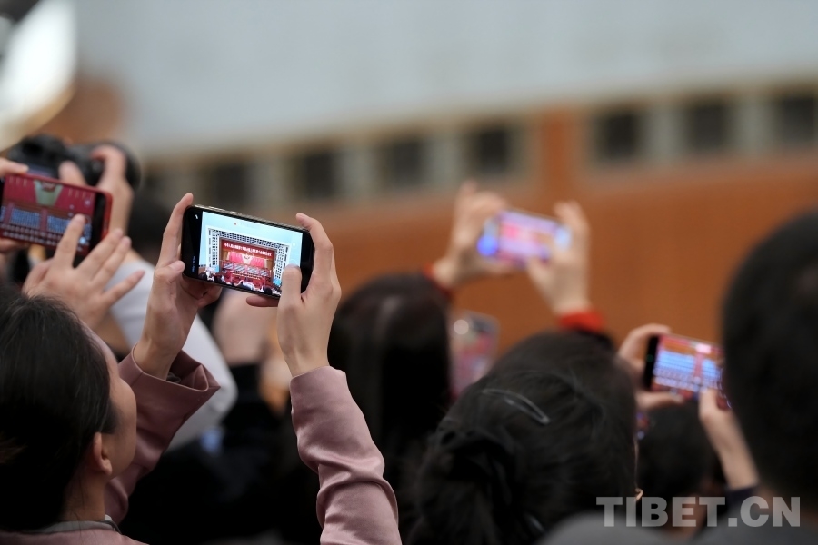3月5日,十四届全国人大四次会议开幕,中外记者用手机拍摄开幕会。摄影:边子捷
