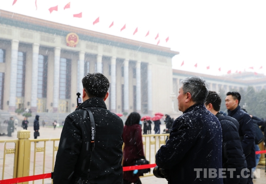 3月4日上午,十四届全国人大四次会议举行预备会议。会议结束后,一场春雪不期而至。在纷扬的大雪中,康巴卫视记者正在工作。摄影:刘莉