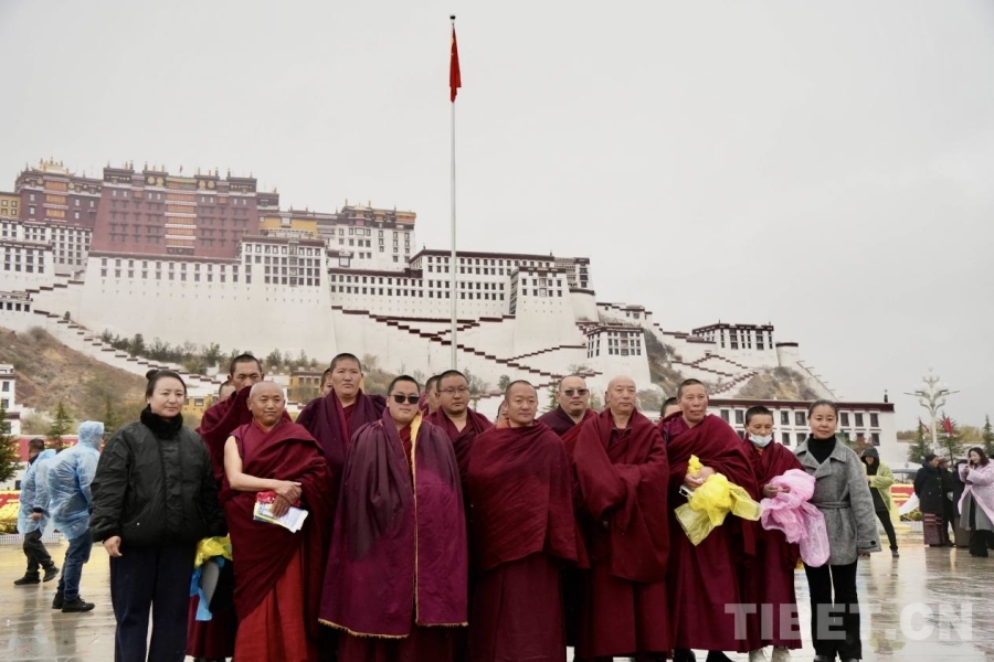 参加升旗仪式的寺院僧尼在布达拉宫广场合影留念