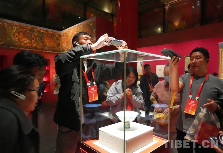 来自西藏各地的农牧民合作组织带头人拍摄展品明宣德青花五彩满池娇图靶碗。