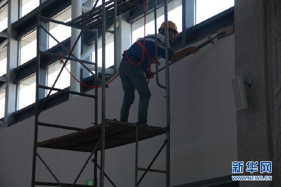 6月28日,在新建的青海省海西蒙古族藏族自治州格尔木火车站,工作人员在清洁车站内壁。新华社记者 王浡 摄