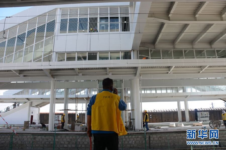 6月28日,在新建的青海省海西蒙古族藏族自治州格尔木火车站,工作人员在指挥施工。新华社记者 王浡 摄