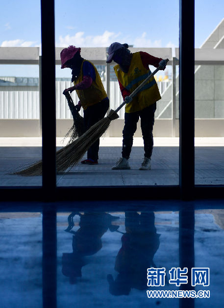 6月28日,在新建的青海省海西蒙古族藏族自治州格尔木火车站,工人在清扫落客平台。新华社记者 张龙 摄