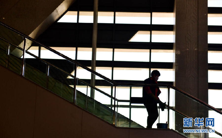 6月28日,在新建的青海省海西蒙古族藏族自治州格尔木火车站,保洁员在清洁楼梯。新华社记者 张龙 摄