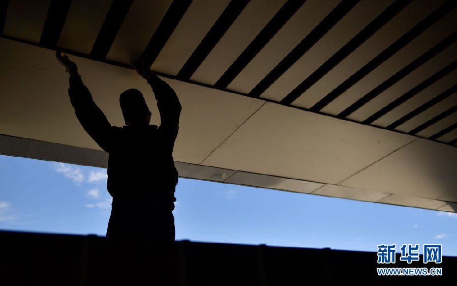 6月28日,在新建的青海省海西蒙古族藏族自治州格尔木火车站,工人在检查站台天花板。新华社记者 张龙 摄