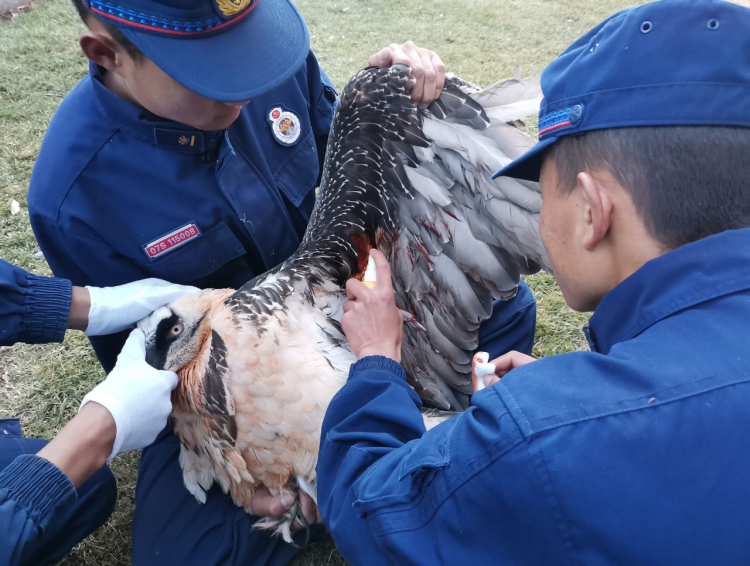 情况紧急,中队指战员立即将受伤胡兀鹫带回中队,安排卫生员对其翅膀受伤部位进行了诊断、清创、消毒、上药等一系列外伤紧急治疗。并对其进行了强制性饮水、喂食,经中队指战员的精心照料和治疗,胡兀鹫脱离了危险,于11月20日上午与卡若区林草局野生动物救助站交接,让工作人员将它带回进一步观察治疗,待它健康后放归大自然。