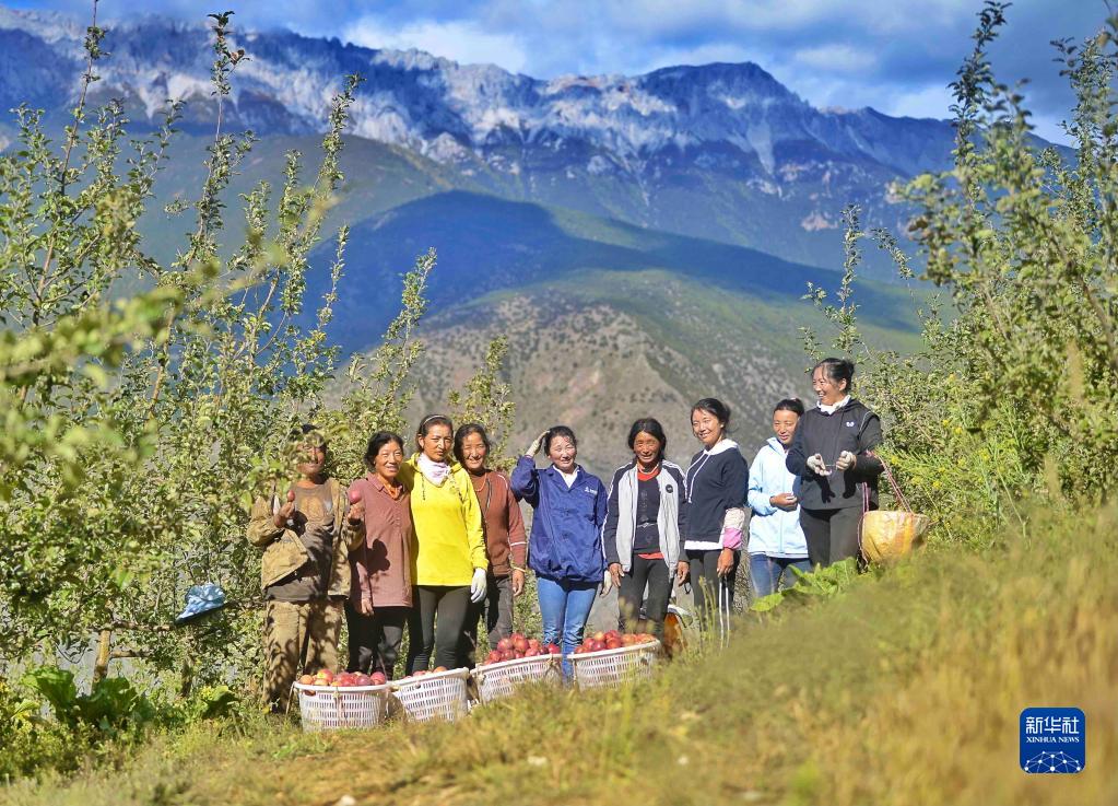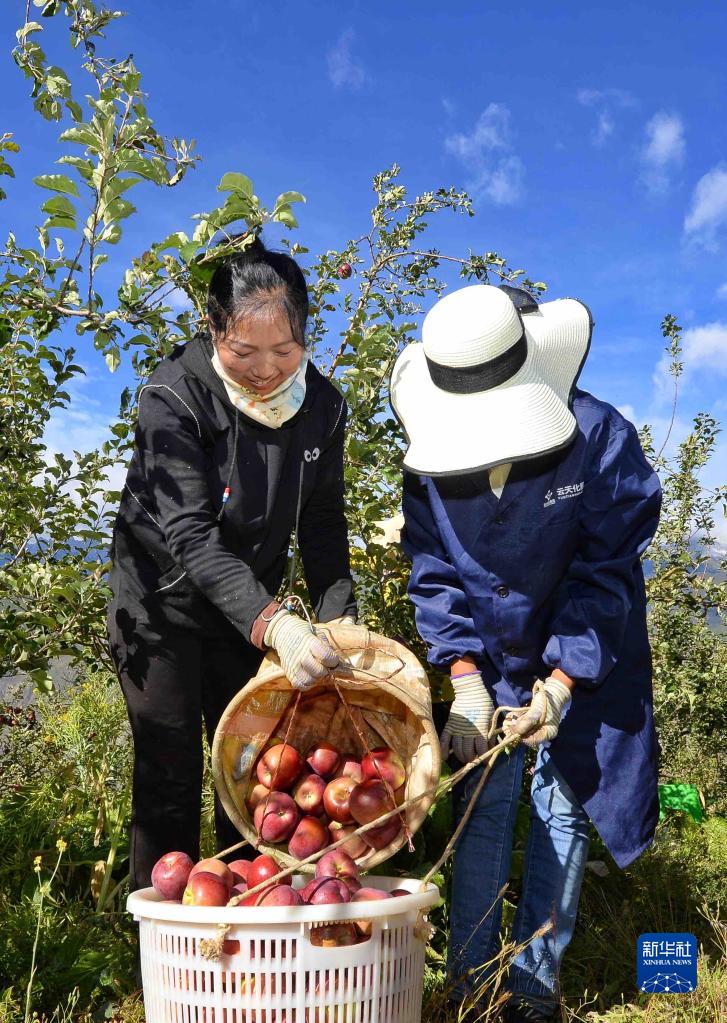 10月20日,在四川甘孜乡城县青德镇万亩果园,村民收集刚采摘的苹果。新华社记者 刘坤 摄