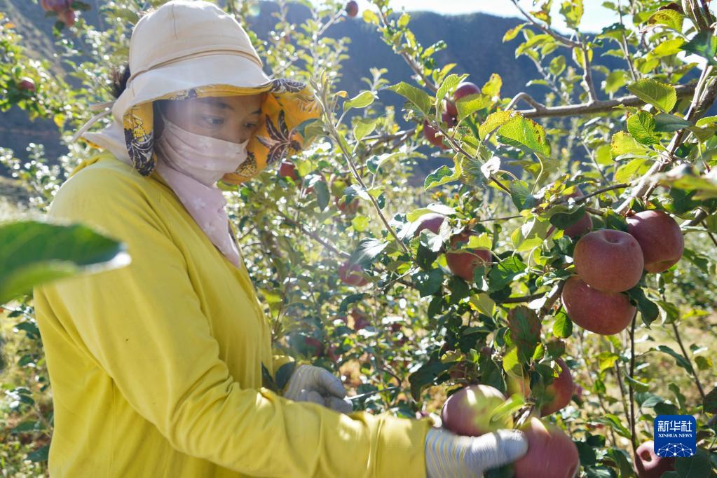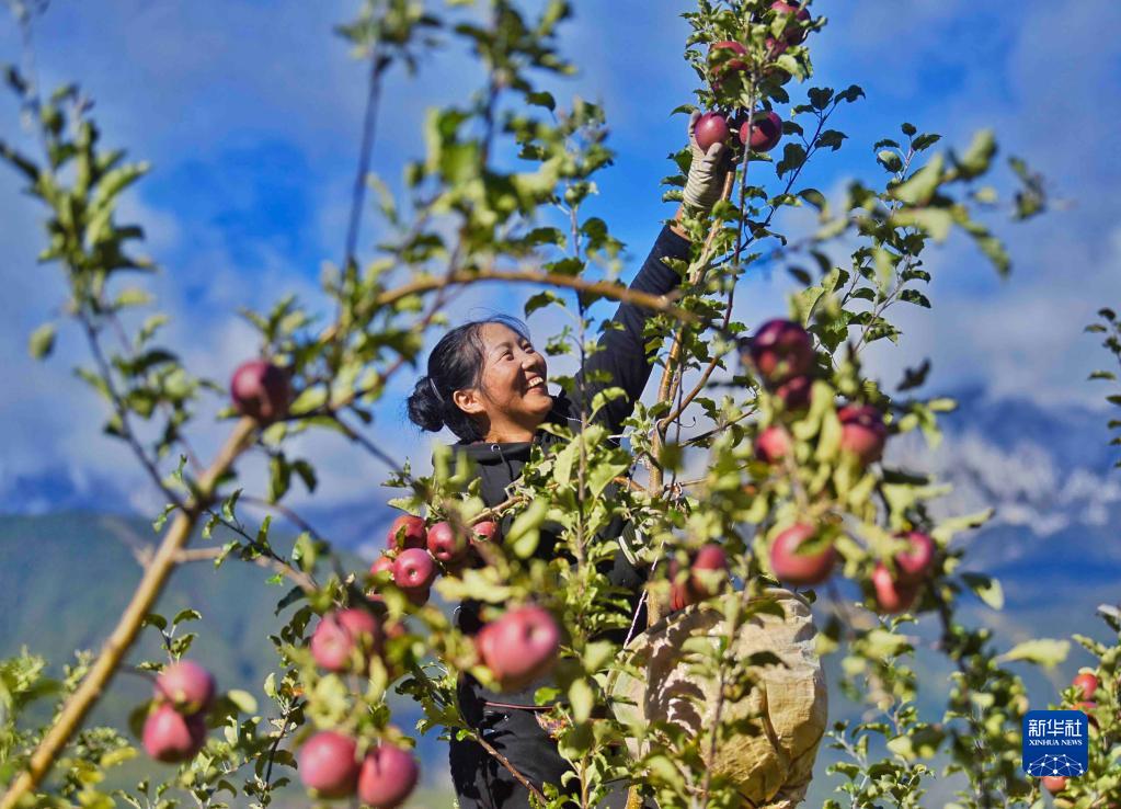 10月20日,在四川甘孜乡城县青德镇万亩果园内,村民在采摘苹果。新华社记者 胥冰洁 摄