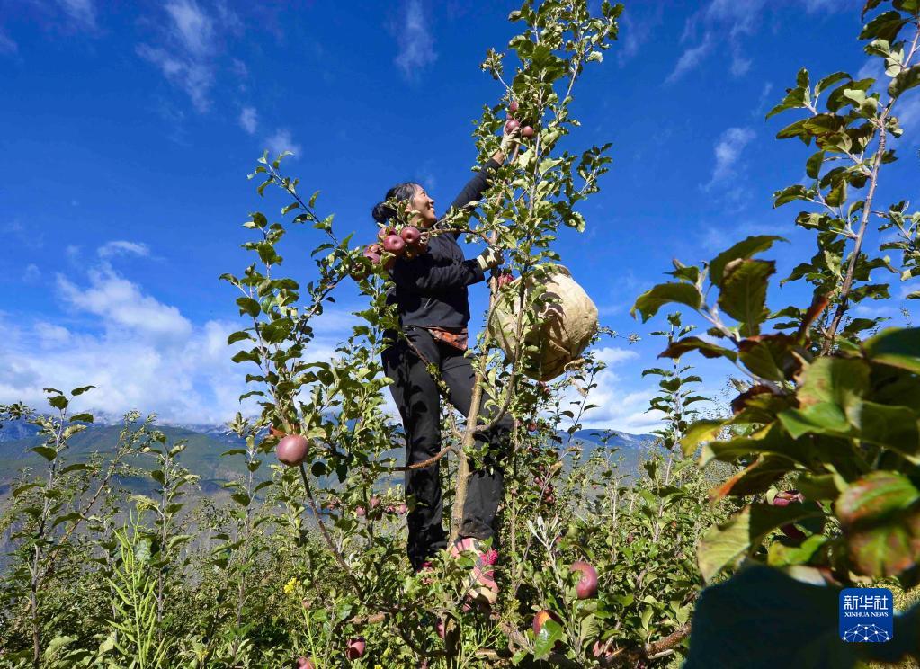10月20日,在四川甘孜乡城县青德镇万亩果园,村民在采摘苹果。新华社记者 刘坤 摄