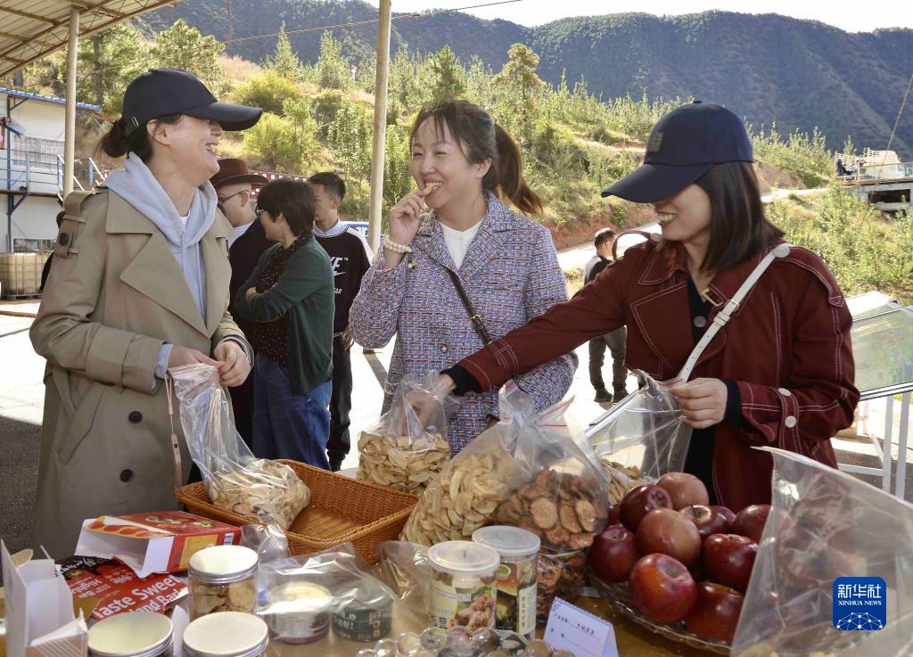 10月20日,在四川甘孜乡城县青德镇万亩果园,来自浙江的客商在品尝苹果干。新华社记者 刘坤 摄