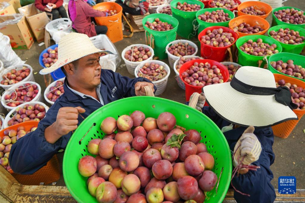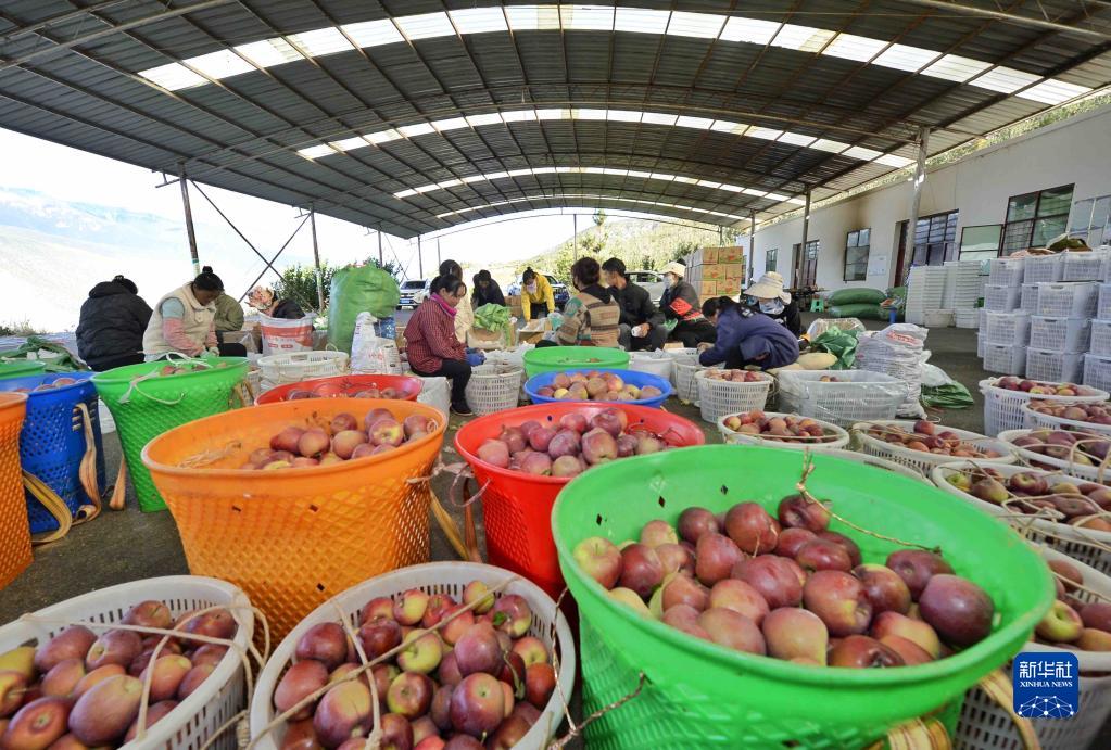 10月20日,在四川甘孜乡城县青德镇,村民们在分拣苹果。新华社记者 刘坤 摄