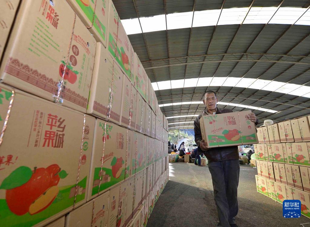 10月20日,在四川甘孜乡城县青德镇万亩果园,村民搬运包装好的苹果。新华社记者 刘坤 摄