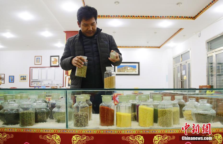 12月8日,青海省黄南藏族自治州尖扎县,五谷画艺人索南本查看农作物储存状况。青稞、小麦、各式油菜籽等农作物经挑选、排列组合,“变身”精美的“尖扎五谷画”。2007年,该县艺人索南本开始创作藏式风格五谷画,摸索防臭、防虫、防潮、装裱等步骤,并在当地开展培训,带领残疾、困难民众进行创作,凭双手致富。 中新社记者 马铭言 摄