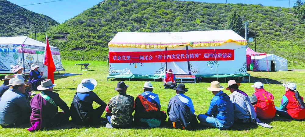 青海省第十四次党代会代表杨生海在阿柔乡宣讲。丁玉梅 摄