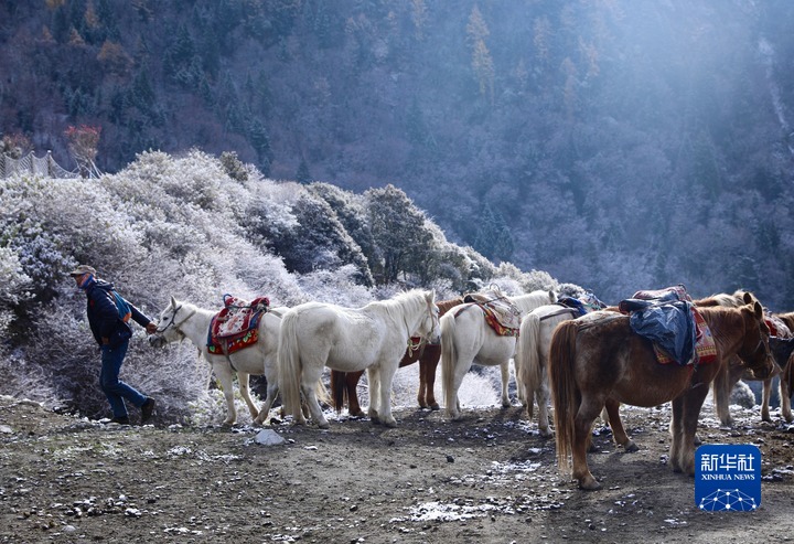 11月8日,工作人员在四姑娘山长坪沟景区内牵马行走。新华社记者 刘琼 摄