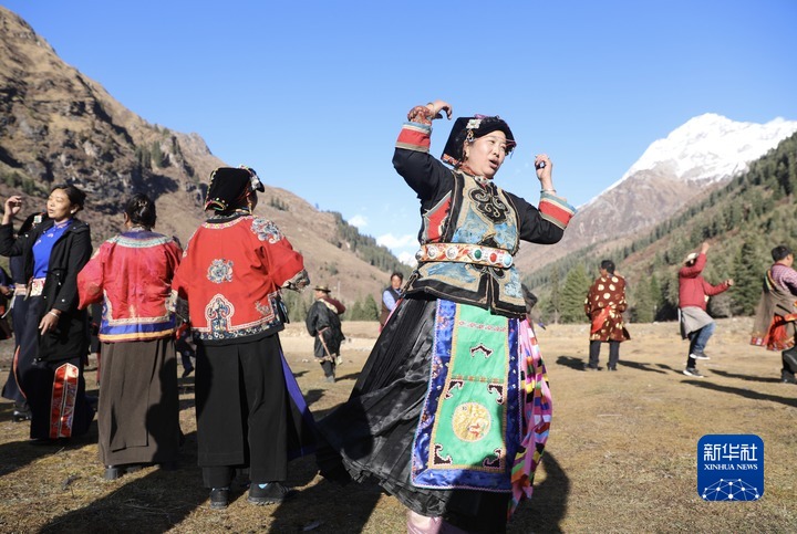 11月5日,小金县向花村村民在雪山下跳锅庄舞。新华社记者 刘琼 摄