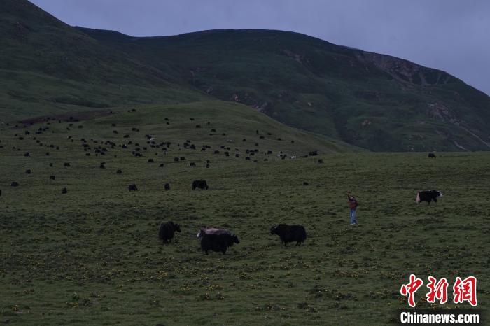 图为麻切仁措在草原上牧牛。马铭言摄