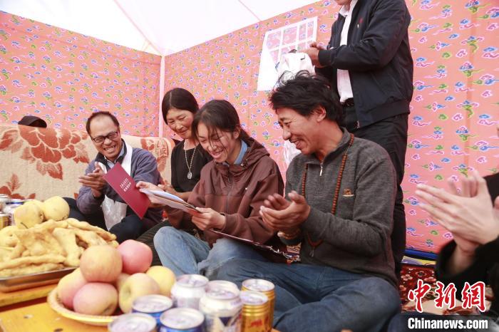 图为果洛州民族高级中学校长李鹏(左一)与麻切仁措一家分享收到录取通知书的喜悦。马铭言摄