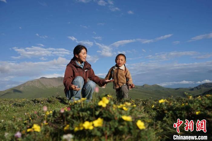 资料图为麻切仁措与弟弟在家乡的草原上歌唱玩耍。马铭言摄