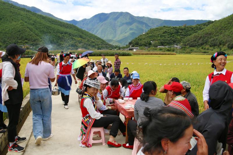 傍晚时分,炊烟氤氲,启别村的百家宴上,稻田鸭、稻田鱼、土鸡肉、腊猪脚、大米饭……香气四溢,金灿灿的稻田边,桌与桌相接,心与心相连,大家在田野里感受着别样丰收。