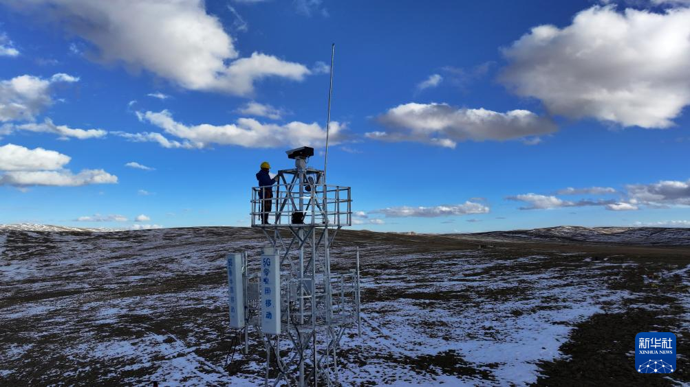 9月20日,中国移动通信集团青海有限公司一名工作人员对黄河源流域约古宗列曲的5G基站进行运维(无人机照片)。新华社记者 韩方方 摄