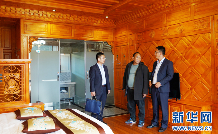 旺青闹加(中)带领邮储银行工作人员参观自家民宿。新华网 生元 摄