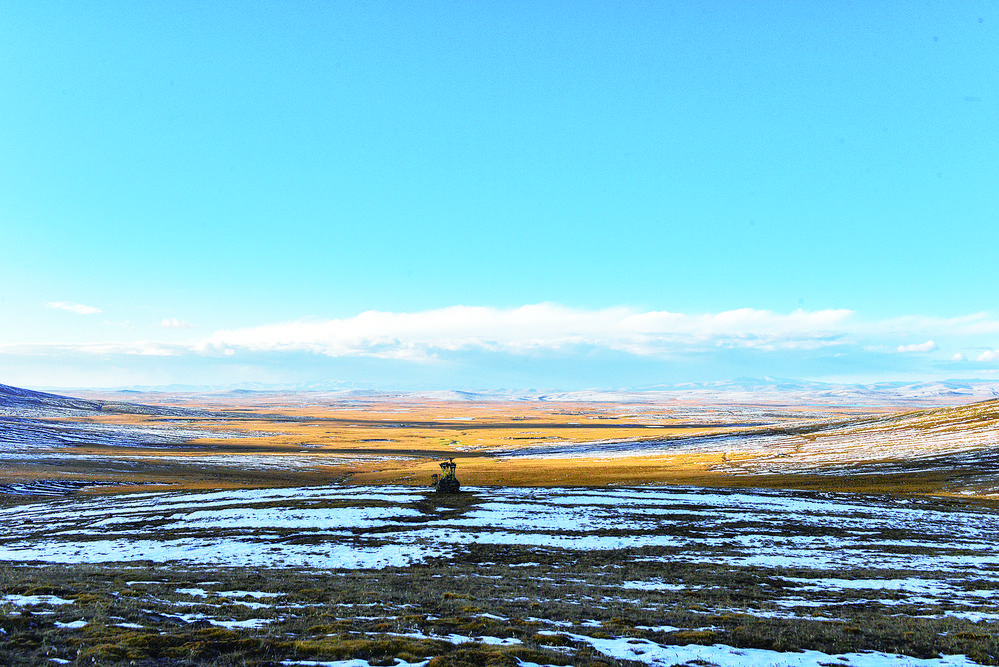 还未入冬,平均海拔5000米的约古宗列曲黄河源头附近的草原上已经飘起了雪,一顶帐篷孤零零地坐落在这里。