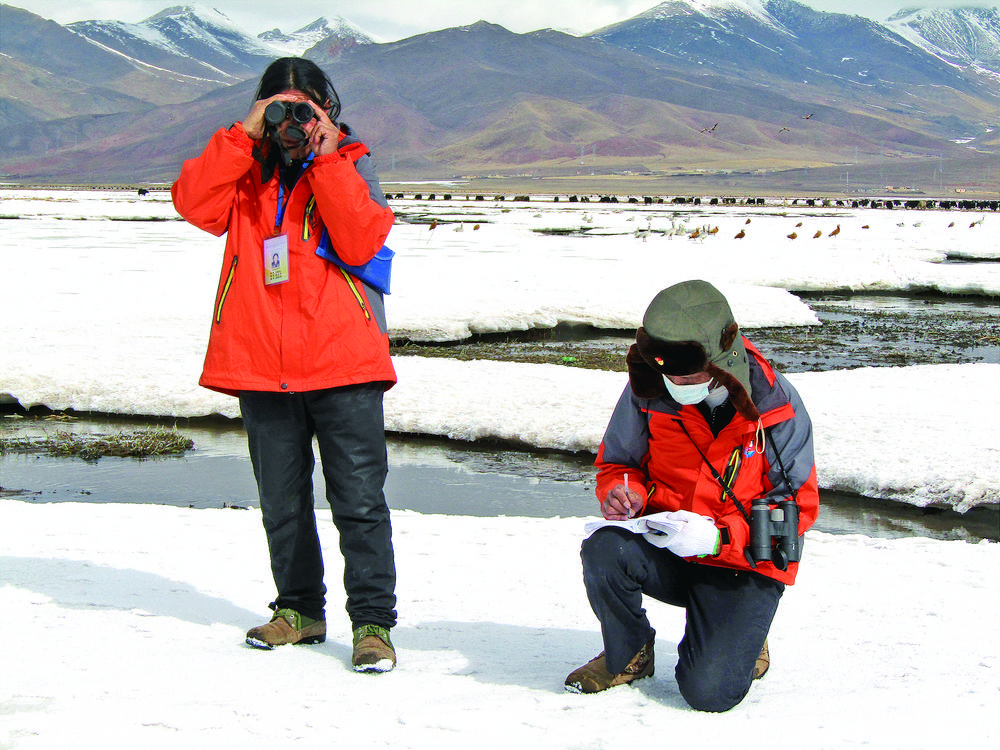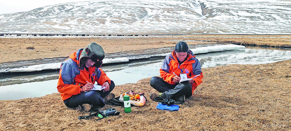 “天刚刚亮,水鸟活动频繁,正是开展监测的好时机。”生态管护员才才和江永才仁一边聊天一边朝着隆宝湖畔走去,开展三月第一次的鸟类调查。