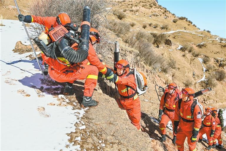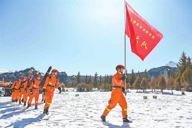 3月7日,在肃南县马蹄藏族乡祁连山深处,张掖市甘州区森林消防大队的消防员们携装穿行林海雪原间开展巡护作业。他们肩负着守护31.53万公顷森林、16个国有林场和12个自然保护站安全的重任。