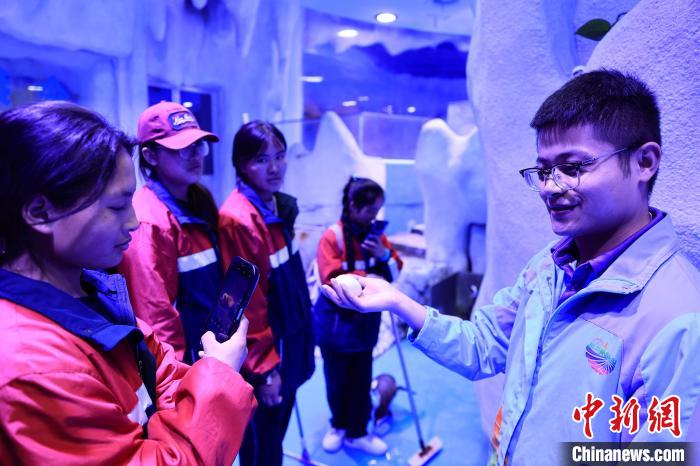 图为讲解员为学生讲解企鹅蛋孵化过程。薛蒂 摄