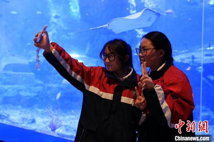 图为学生参观拍摄水族馆。薛蒂 摄