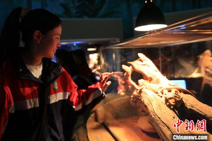 图为学生与两栖动物互动。薛蒂 摄
