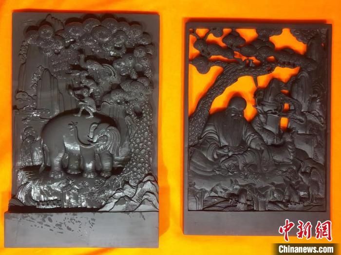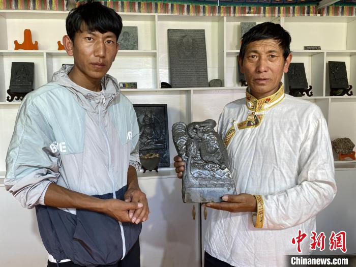 图为多节才旦(左)与才旦加(右)展示泽库和日寺石刻作品。受访者供图