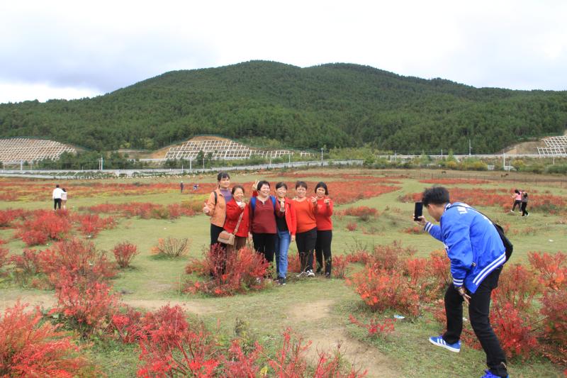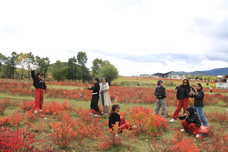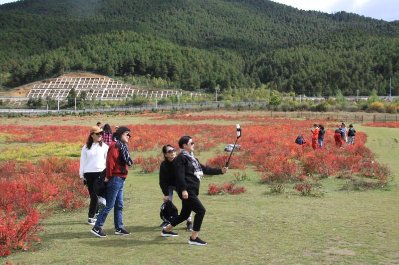 连日来,香格里拉迎来狼毒最佳观赏期,众多国内外游客被草原上一片片火红的狼毒所吸引,纷纷驻足观赏。图为游客在香格里拉市小中甸草原赏狼毒、拍照留影。