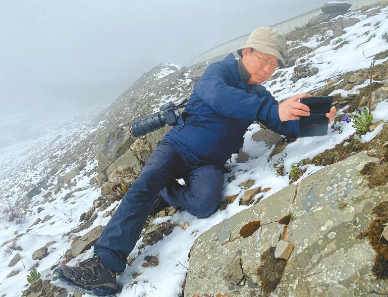 阿来在巴朗山拍花。四川日报全媒体记者 肖姗姗 摄