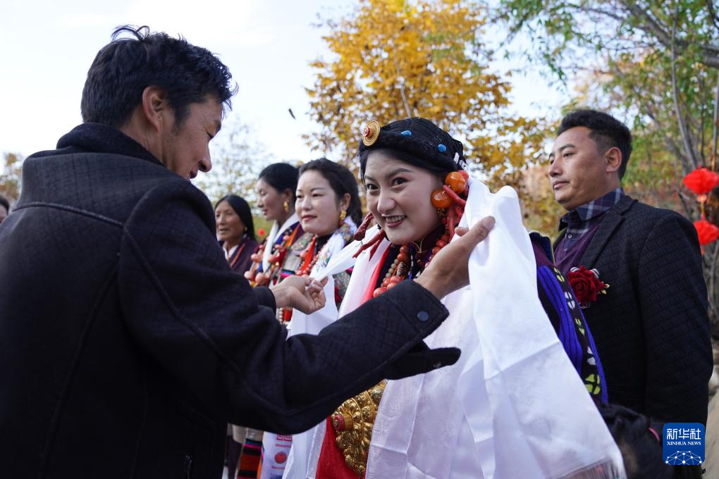 11月2日,在仲德村的一场婚礼上,新娘罗绒扎姆(右二)接受客人的哈达祝福。新华社记者 胥冰洁 摄