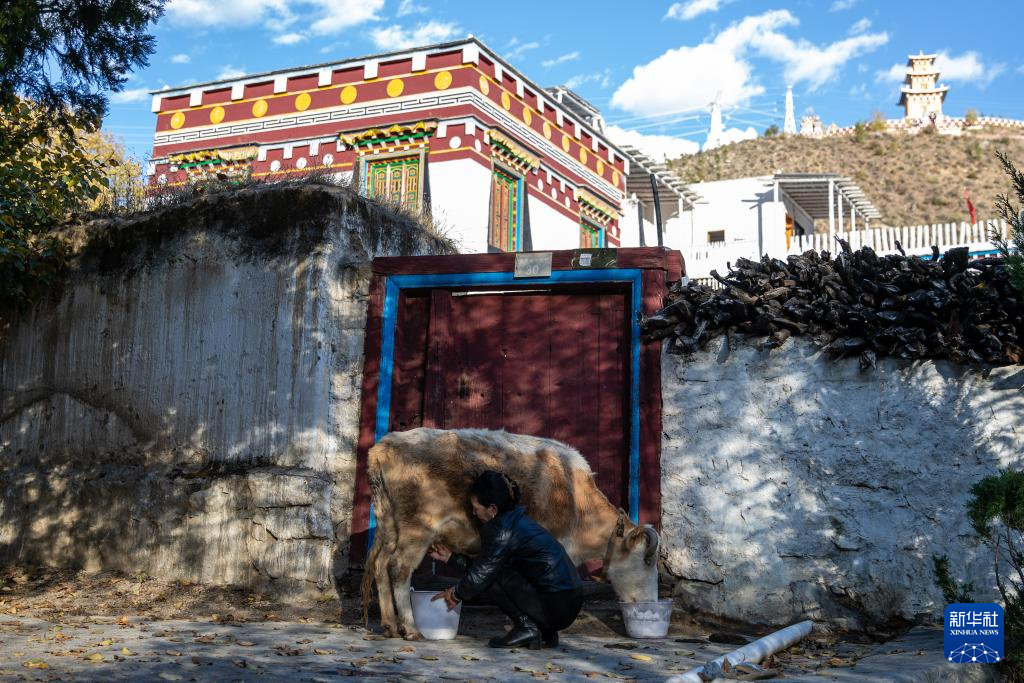 11月2日,仲德村村民四朗拥初在家门口挤牛奶。新华社记者 储加音 摄