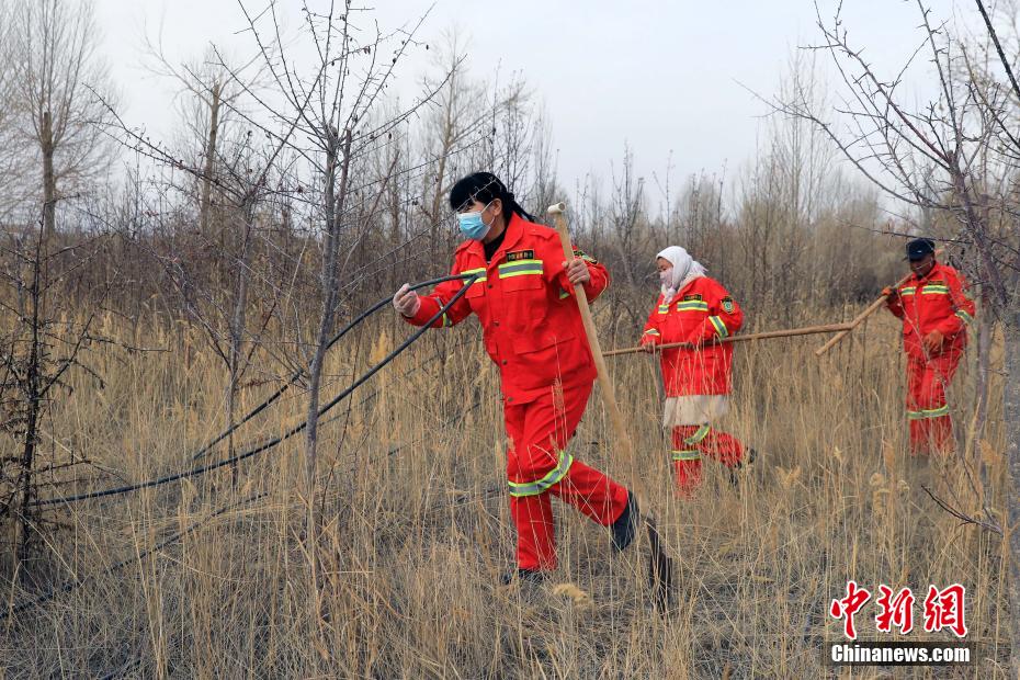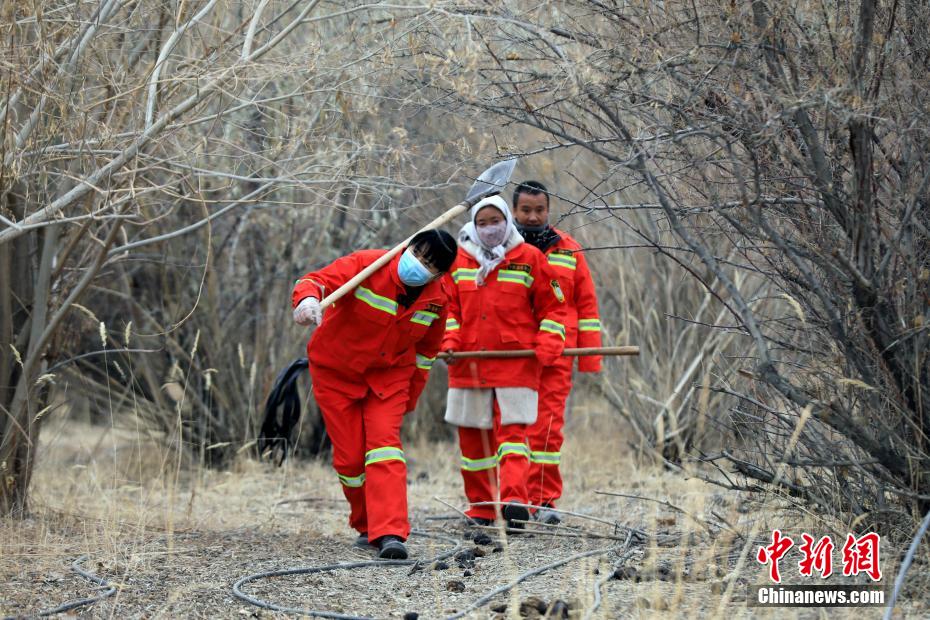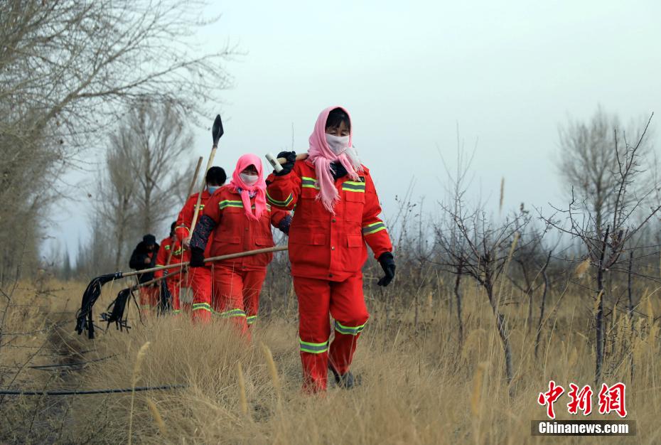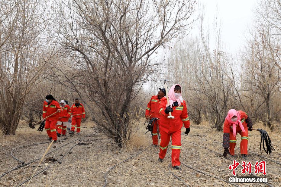 12月9日,护林员在千亩林中心林地整理浇灌的水管线。中新社记者 王磊 摄