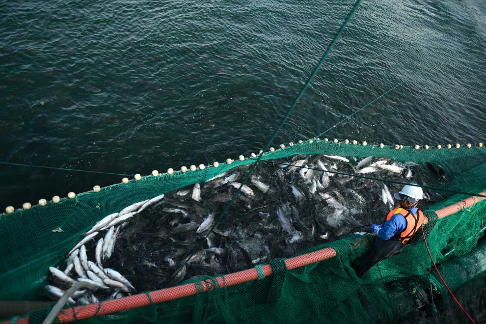 “传统吊网捕捞会让虹鳟鱼体内因紧张产生更多肌酸。我们现在用吸鱼泵连鱼带水直接送入车间,保证鱼肉质鲜嫩。”他说。