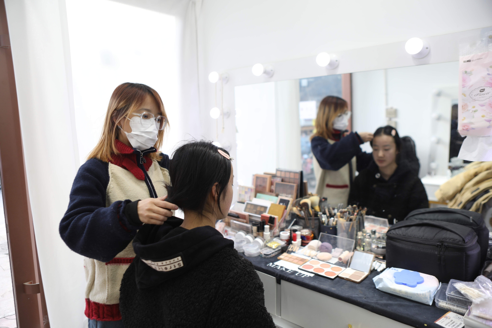 蒙春芳(左一)正在给客人化妆。新华社记者 张睿 摄