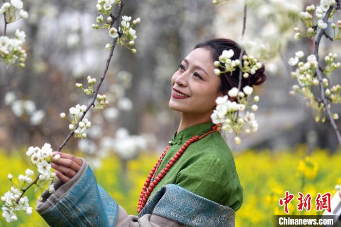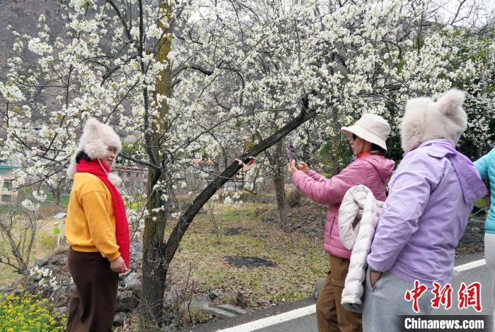 图为游客在梨树下拍照。中新社记者 安源 摄