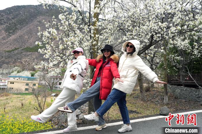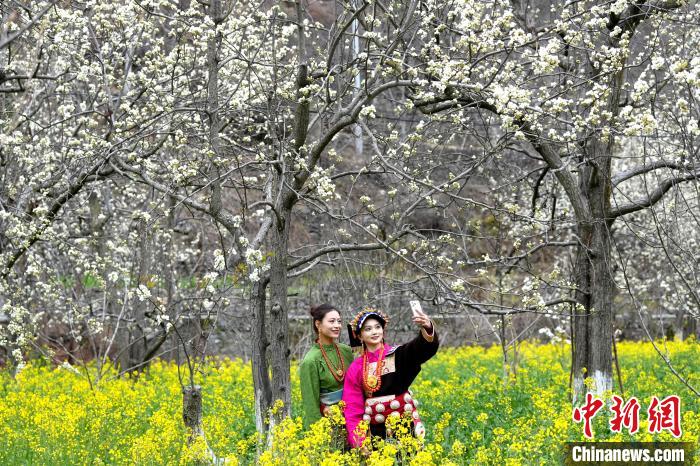 图为藏族姑娘在梨树下拍照。中新社记者 安源 摄