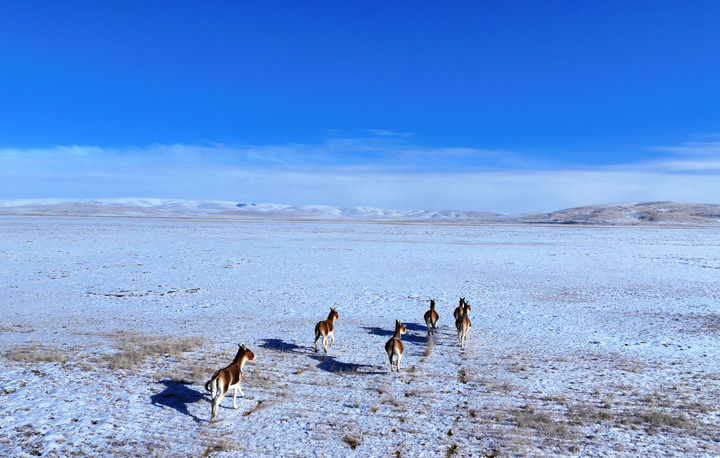 在青海省果洛藏族自治州玛多县黄河乡境内,藏野驴在雪后活动(2025年2月22日摄,无人机照片)。新华社记者 张宏祥 摄