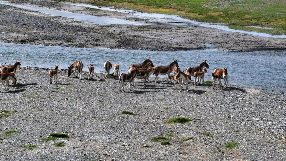 这是2024年8月9日在位于三江源国家公园长江源园区的曲麻莱县境内拍摄的藏野驴(无人机照片)。新华社发(昂江 摄)
