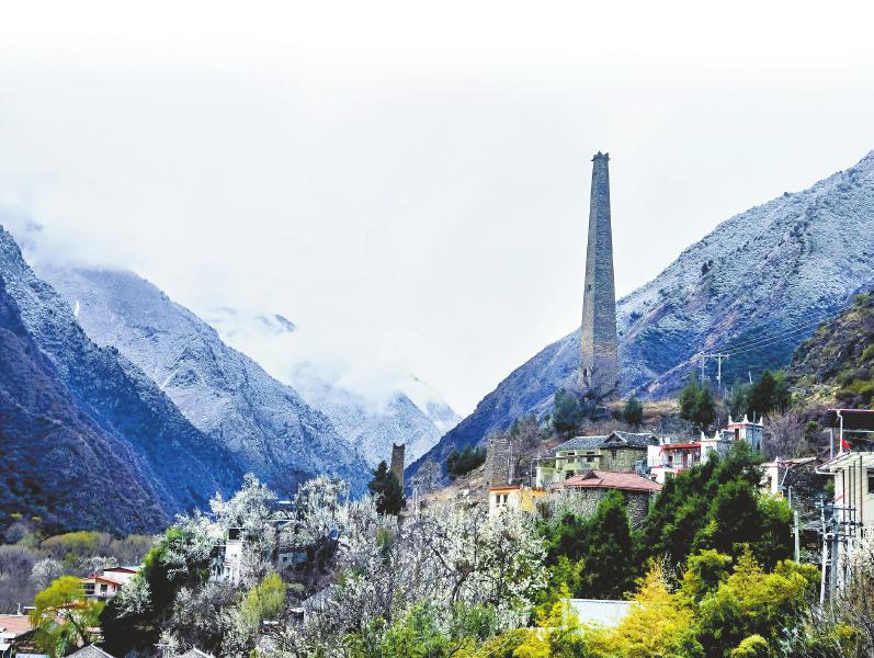 大金川河谷盛开的梨花与雪景、碉楼交织成一幅美丽的画卷。代永清 摄