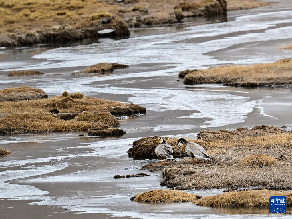 4月8日,两只斑头雁在青海隆宝国家级自然保护区内活动。新华社记者 张龙 摄