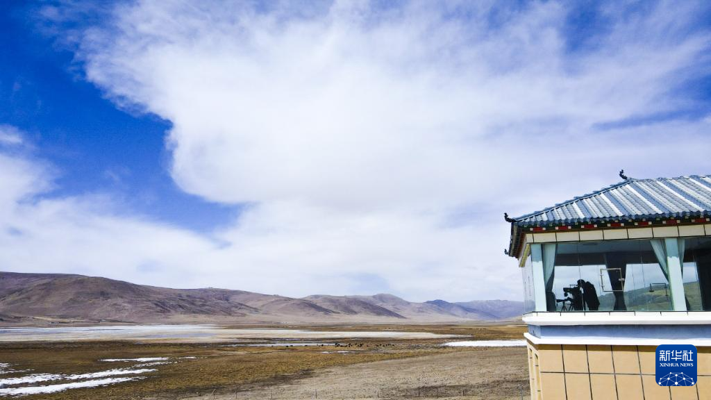4月8日,生态管护员在青海隆宝国家级自然保护区管理站观测鸟类(无人机照片)。新华社记者 齐芷玥 摄