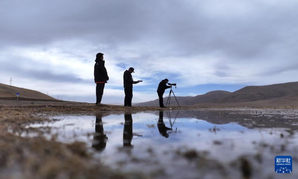 4月8日,青海隆宝国家级自然保护区生态管护员才仁多杰(右一)和同伴一起观测候鸟(无人机照片)。新华社记者 张宏祥 摄